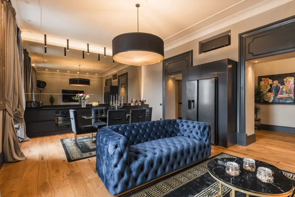 The interiors are enriched with Italian pop art, three 17th-century Armenian kimonos, and five 18th-century gilded paintings, creating a unique and refined atmosphere.